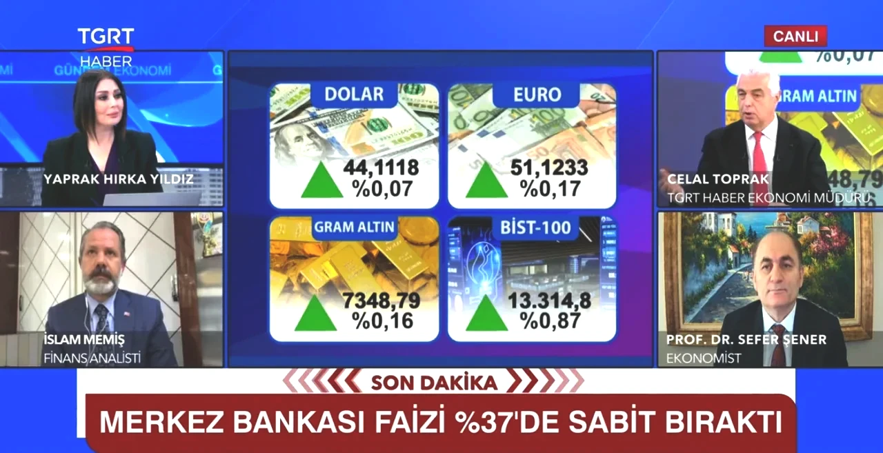 Türkiye Cumhuriyeti Merkez Bankası, yılın ikinci çeyreğine ilişkin faiz kararını duyurdu. Para Politikası Kurulu, politika faizini yüzde 37 seviyesinde koruma kararı aldığını açıkladı. TGRT Haber'in canlı yayınına katılan Ekonomi Müdürü Celal Toprak, Altın Piyasaları Uzmanı İslam Memiş ve Prof. Dr. Sefer Şener, Merkez Bankası'nın aldığı bu kararın Türkiye ekonomisi üzerindeki muhtemel etkilerini tartıştı.