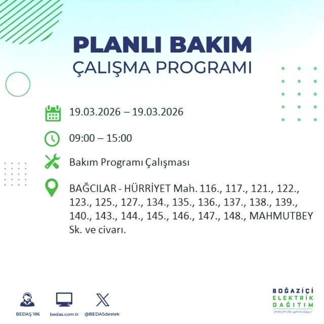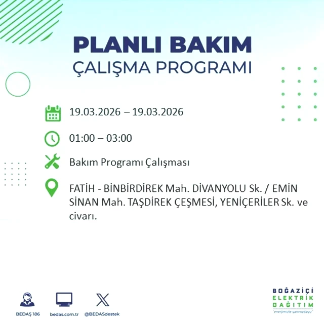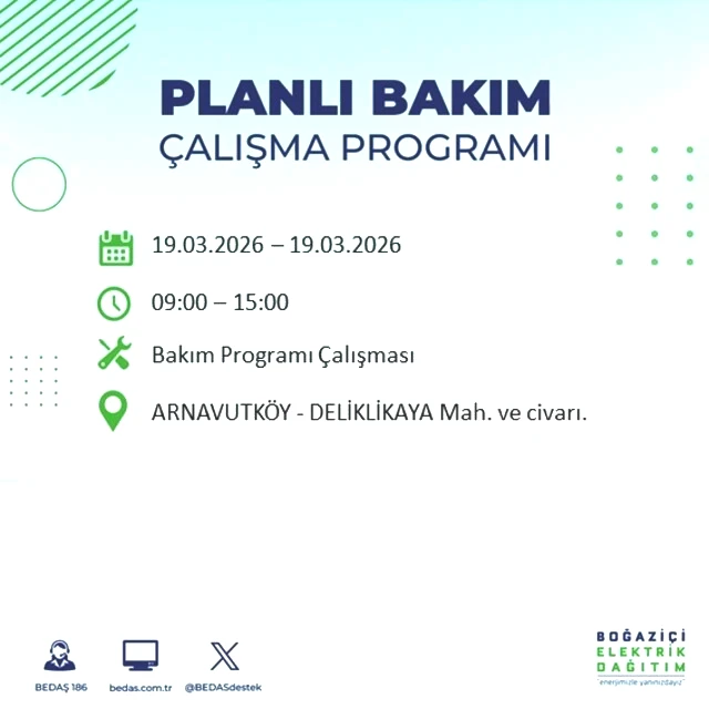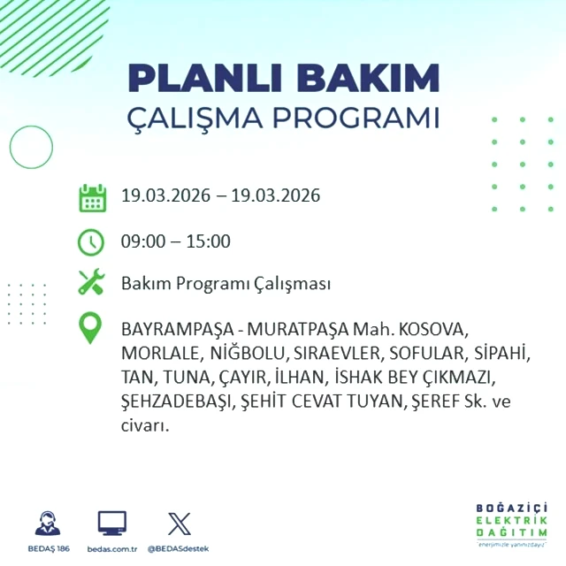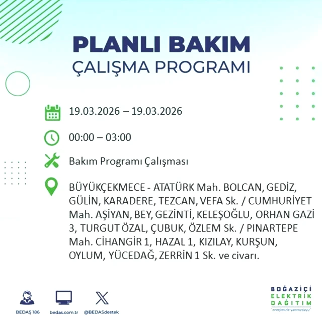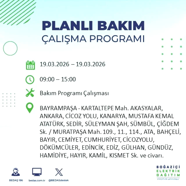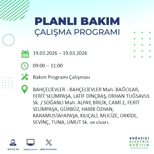 BEDAŞ tarafından yapılan duyuruya göre, 19 Mart Perşembe günü İstanbul'un çeşitli bölgelerinde elektrik kesintileri gerçekleşecektir. Kesintilerin yaşanacağı yerler ve elektriklerin geri geleceği saatler belirlendi. Peki, 19 Mart Perşembe günü İstanbul'da elektrik kesintileri hangi saatlerde başlayacak ve enerji ne zaman yeniden sağlanacak? İşte İstanbul elektrik kesintisi ile ilgili detaylar...