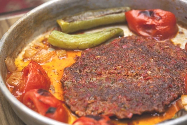 Hazırladığınız et harcını bir fırın tepsisine eşit kalınlıkta yayın. Kebap pişerken küçüleceği için kenarlara iyice bastırın. Bıçakla kebabı dilimler halinde kesin. Üzerine domates ve biber dilimlerini yerleştirin.